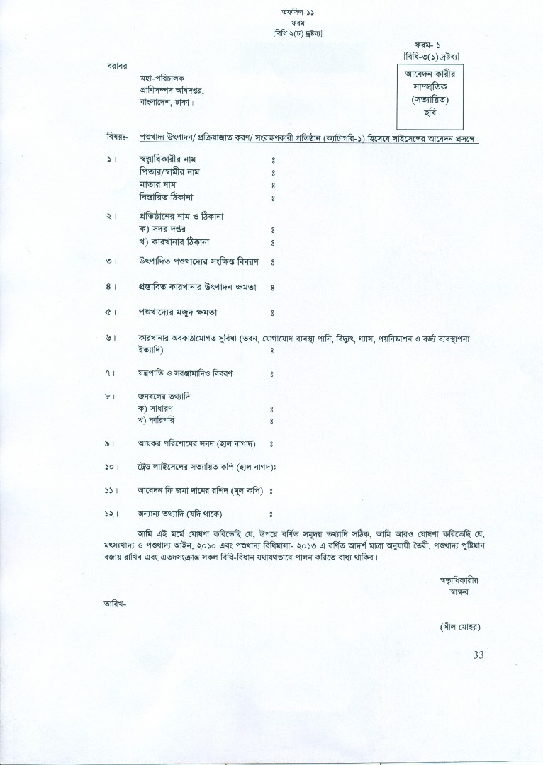 ১। পশুখাদ্য ক্যাটাগরি-১ লাইসেন্স আবেদন ফরম