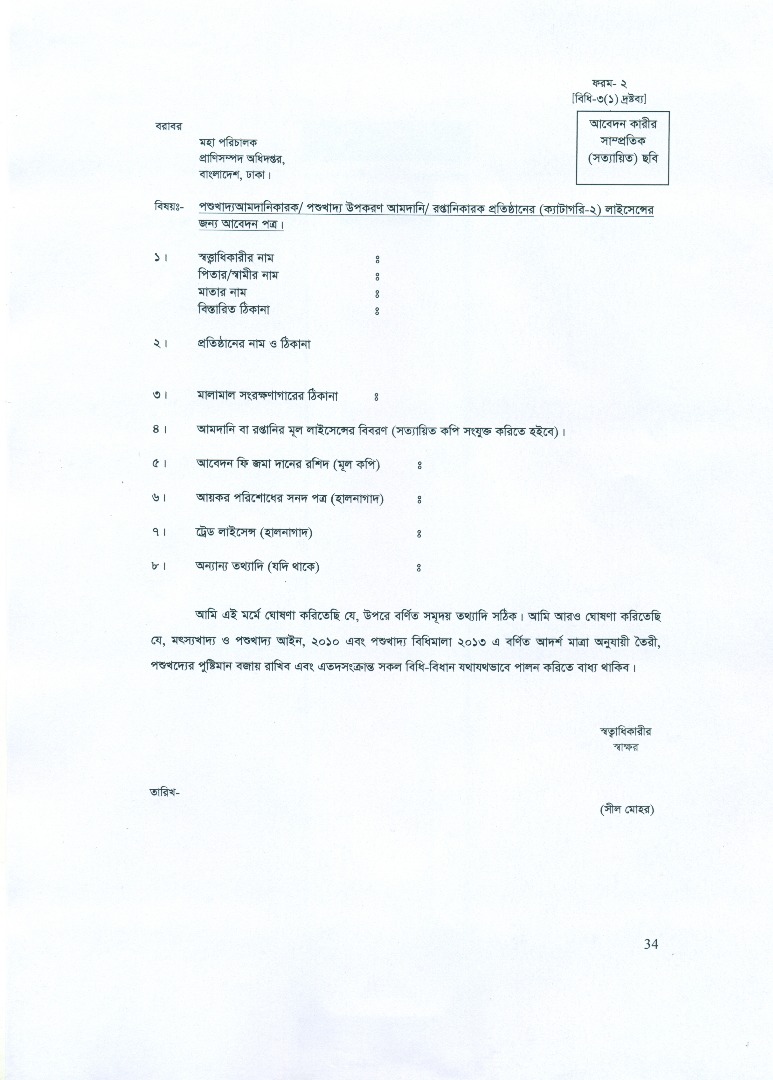 ২। পশুখাদ্য ক্যাটাগরি-২ লাইসেন্স আবেদন ফরম